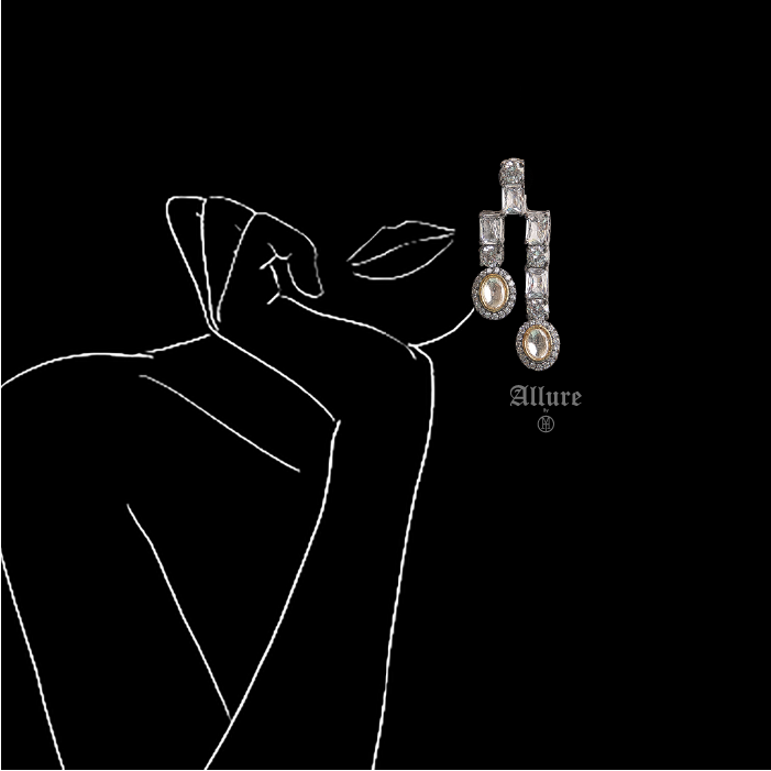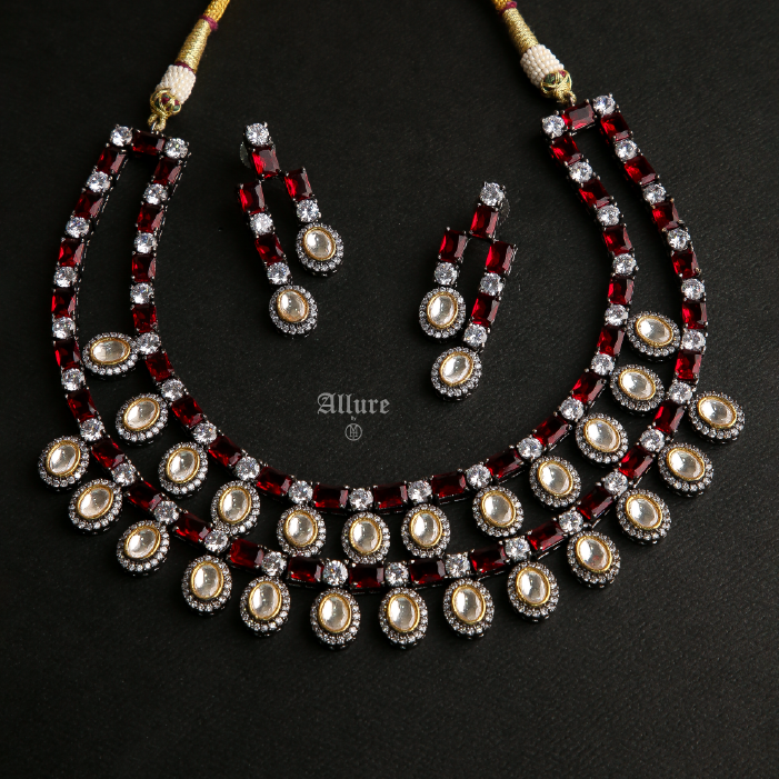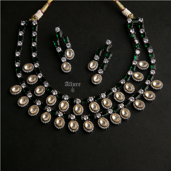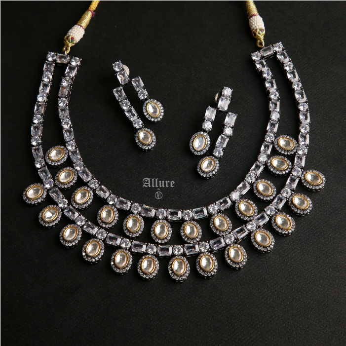 Bijou, an exquisite diamond-inspired jewelry set that radiates elegance. The two-tiered necklace showcases stunning baguettes adorned with hanging teardrops, while polki is delicately set amidst sparkling Zirconia, enhanced by luxurious gold accents. Paired with matching earrings, this set adds a timeless charm and brilliance, perfect for any special occasion or celebration. Bijou is a true statement of sophistication and grace.   1. Due to the delicate nature of our jewelry, we regretfully cannot accept returns or exchanges. 2. Meticulously crafted using high-quality alloy, adorned with radiant gold/rhodium plating. 3. To maintain its allure, kindly refrain from contact with perfume or water. 4. Handle with care to keep your jewelry looking flawless over time. 5. Crafted to replicate the charm of fine jewelry without the high cost. 6. Created to be gentle on sensitive skin, offering both style and comfort. 7. Store in provided pouch or box to prevent damage and tangling. 8. Store in an airtight container to protect against tarnishing.  |