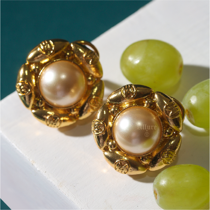 Bloomingdale, features a beautifully crafted floral design, showcasing a delicate faux pearl at the center, surrounded by a bold, chunky gold bloom. The intricate gold petals are embossed with the signature MHT logo, adding a touch of refinement to every pair.
