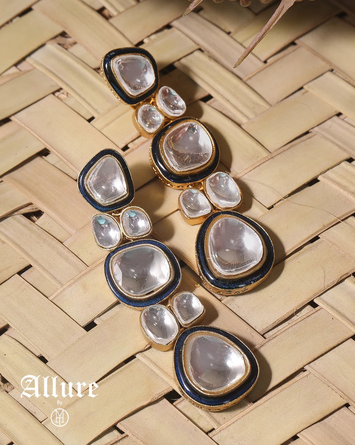 From Meera’s Classic collection comes the Chromatic Drops – a design that lets the brilliance of stones take center stage. Inspired by the fluidity of falling rain, each drop-shaped stone is bordered with delicate work, adding just enough color to frame their natural shimmer. The stones sit in a graceful vertical cascade, their organic shapes catching soft light with every glance, making them just as fitting for a daytime gathering as for an evening celebration. Available in blue, red, and green, these earrings balance understated elegance with a hint of festivity.