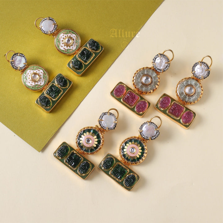 Quinton features a striking mother of pearls with Zirconia around the edges, a takkad or enamel center paired with carved stones at the bottom set on a solid colored stone that looks absolutely chic.