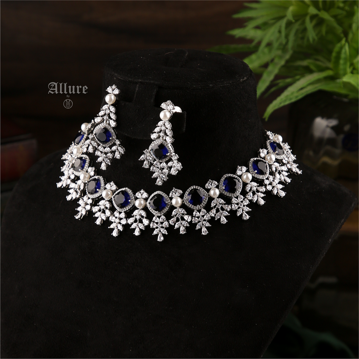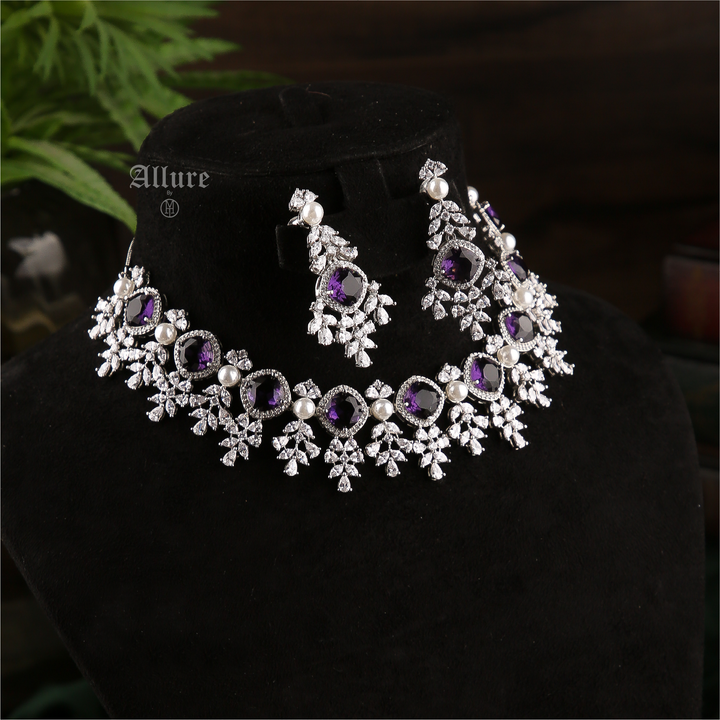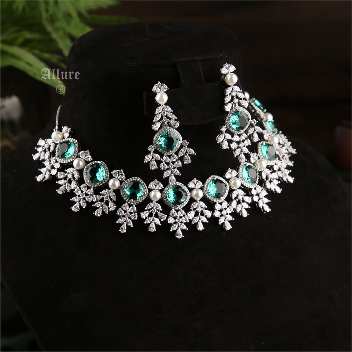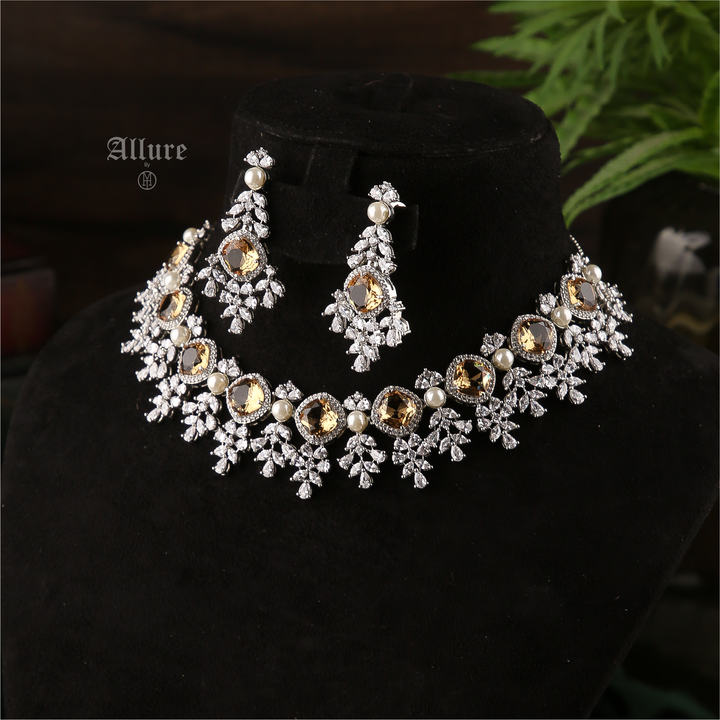 A contemporary diamond inspired necklace with Zirconia and colored jades paired with matching earrrings that look drop, dead gorgeous.