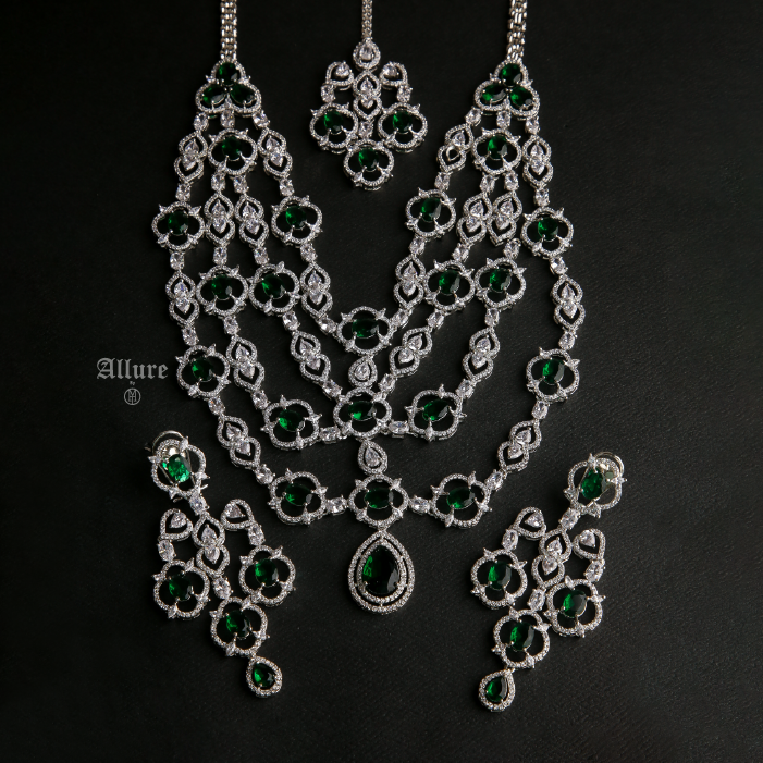 Éclat – a stunning diamond-inspired jewelry set, perfect for your bridal trousseau. The four-tiered necklace, adorned with vibrant colored jades, adds a captivating pop of color, while the chandelier-inspired earrings and matching teeka complete the ensemble with elegance. Crafted to make you shine, ?âclat is a breathtakingly beautiful set that ensures all eyes are on you. 1. Due to the delicate nature of our jewelry, we regretfully cannot accept returns or exchanges. 2. Meticulously crafted using high-quality alloy, adorned with radiant gold/rhodium plating. 3. To maintain its allure, kindly refrain from contact with perfume or water. 4. Handle with care to keep your jewelry looking flawless over time. 5. Crafted to replicate the charm of fine jewelry without the high cost. 6. Created to be gentle on sensitive skin, offering both style and comfort. 7. Store in provided pouch or box to prevent damage and tangling. 8. Store in an airtight container to protect against tarnishing.¬† |