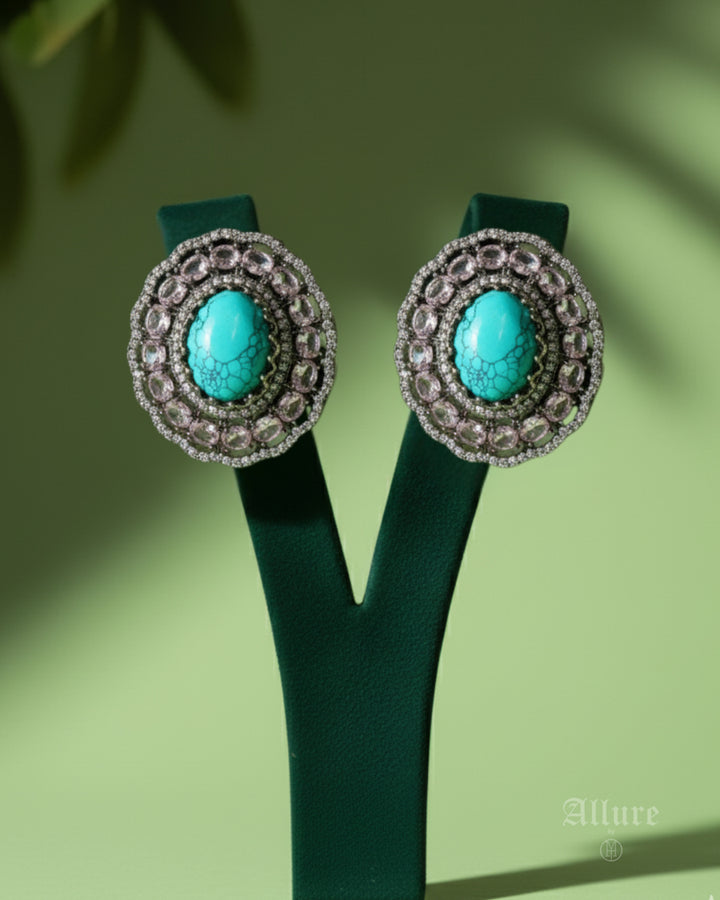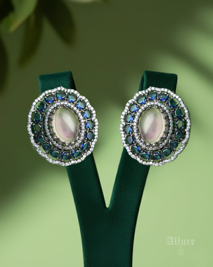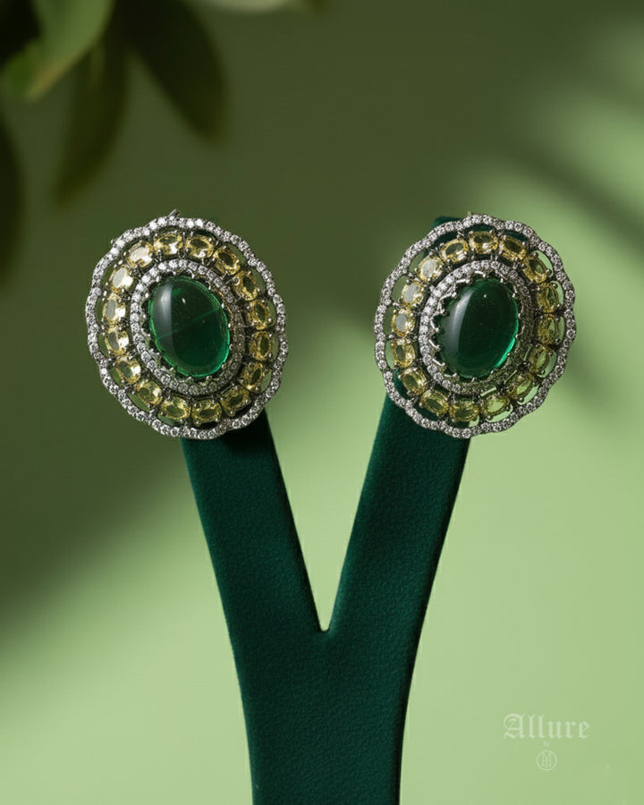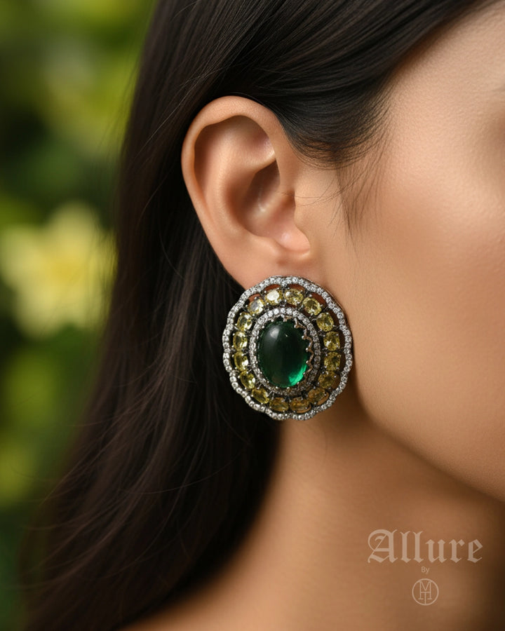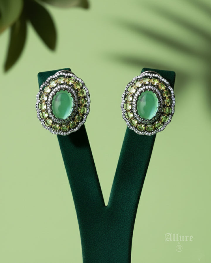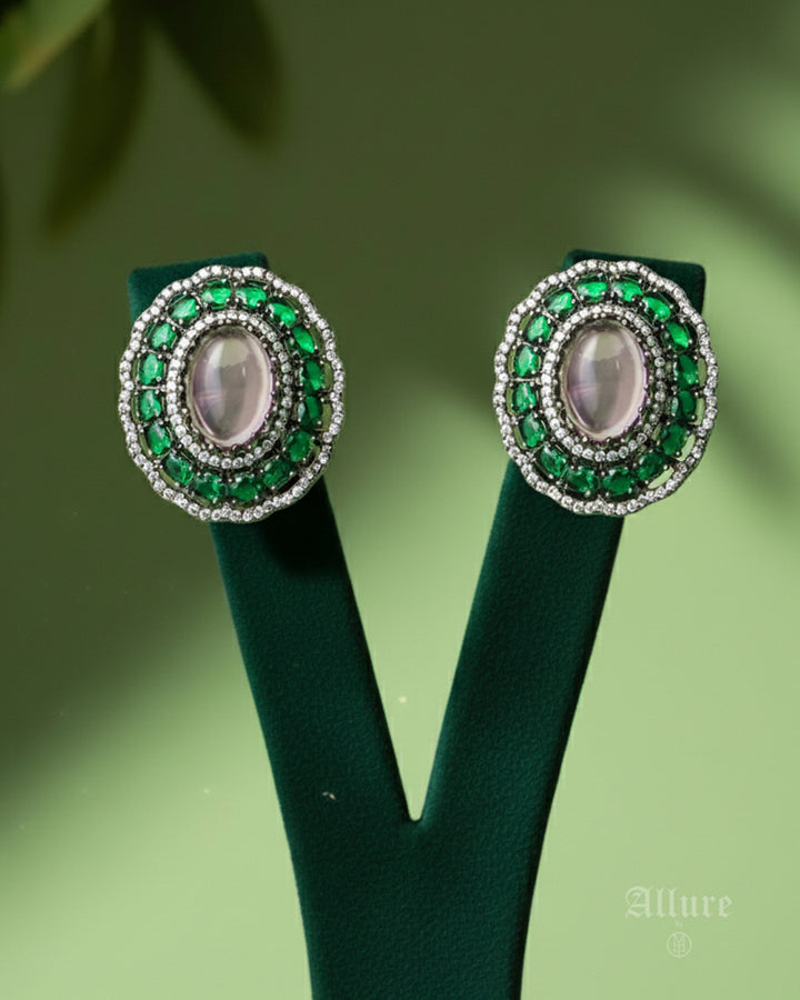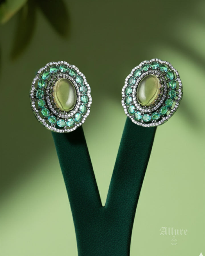 A tribute to royal heirlooms, Regalia features a deep emerald-green cabochon as its heart, set within a delicately sculpted antique-silver lattice. Tiny hand-placed crystals rim the edges, forming a luminous halo that magnifies the gem’s rich green depth. The symmetrical Oval form and finely textured victorian finish give these studs the poise of a vintage court jewel — bold yet wearable for both festive and formal settings.