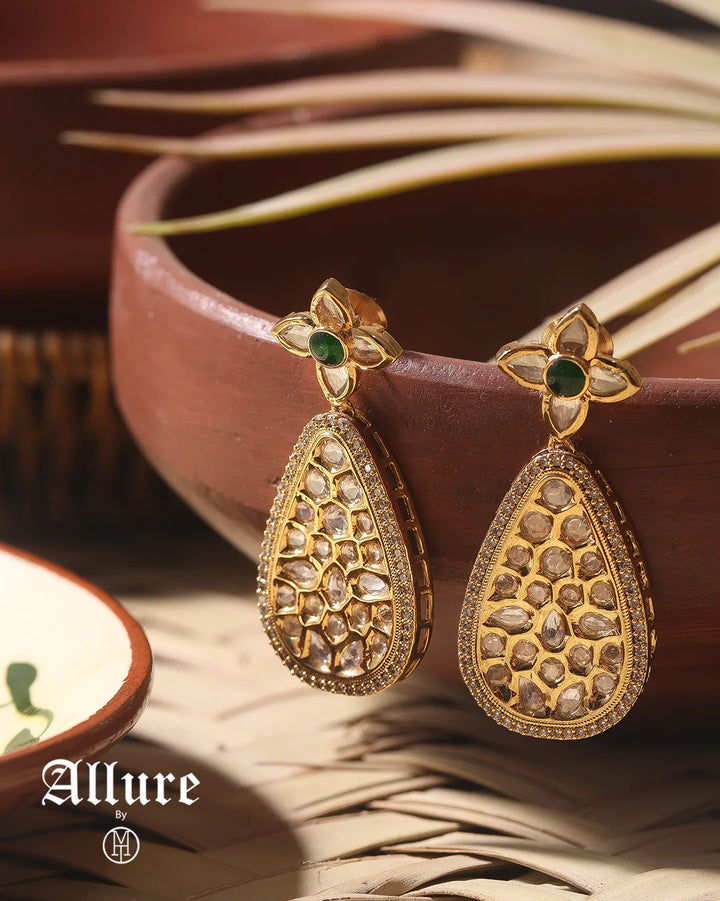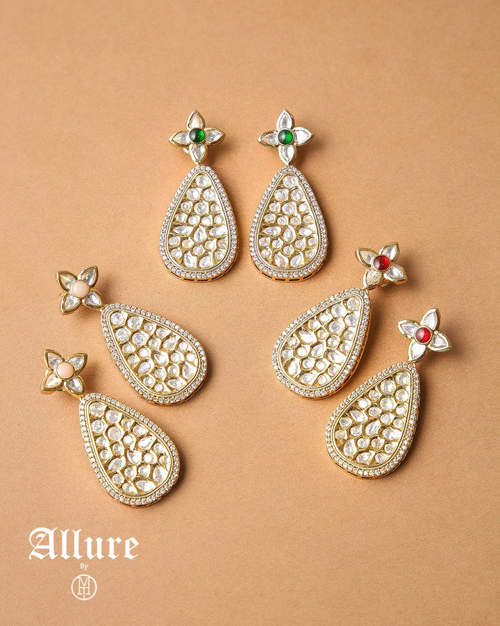 Named for the drop it resembles, Elan Boond is a study in small, striking design. Set in a gold-plated base and accented with colour-rich stones in red, green, or white, each piece carries presence through shape and shine alone. The silhouette is short and curved, designed to sit neatly on the lobe while catching the light with every turn. Pair it with a churidar set for dholki, wear it with a classic saari at a nikkah, or let it add polish to a silk kameez on Eid. It’s made for occasions where elegance lies in restraint.