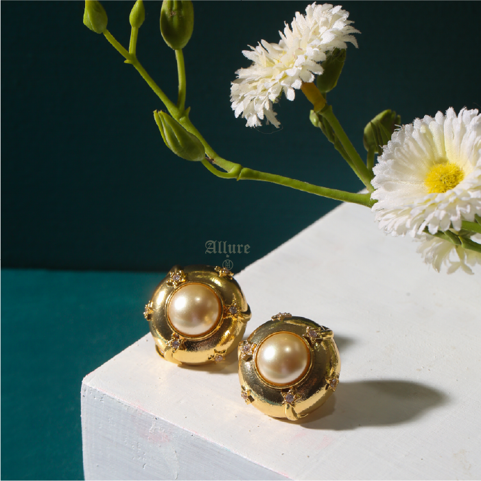 Indulge in timeless elegance with Elba, a statement piece from our exclusive Limited Edition collection. Featuring a chunky faux pearl stud, this design is elevated by a vibrant gold finish and dazzling zirconia accents, adding a touch of glamour to any look.