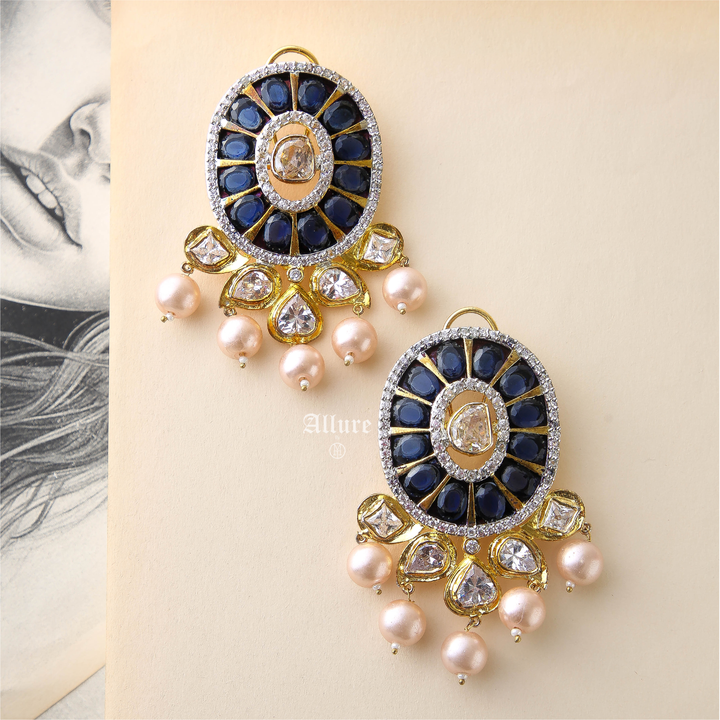 Back with a bang, the Erica earrings are a cult favorite. Featuring Rose Cut American Diamonds, Zirconia, colored jades and faux pearls, the earring is completed with faux pearls that look ethereal.