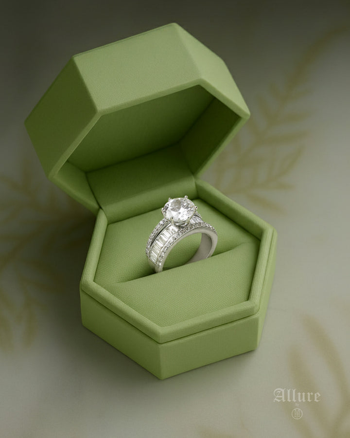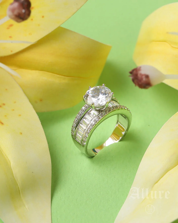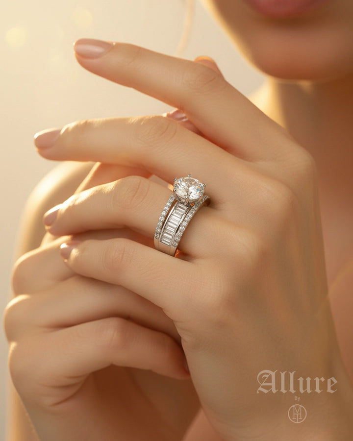 A study in minimalist refinement, Maison Classique presents a flawless round-cut white solitaire elevated on a split double band. Single band is micro-pav?© set with tiny crystals, lending a subtle shimmer that frames rather than competes with the central stone. Its clean lines and balanced proportions evoke the quiet elegance of Parisian maisons de joaillerie ‚Äî perfect for understated bridal or daily wear.