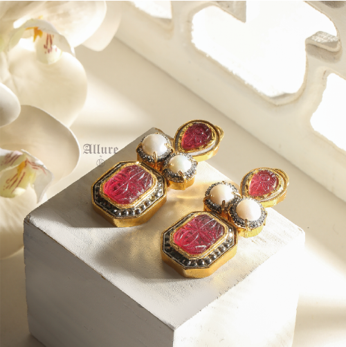 Ethereal: a modern earring that exemplifies exquisite craftsmanship. The design features a teardrop hand-carved bold red stone with enamel (meenakari) around the edges. Paired with pearls set amidst Zirconia with a metallic finish, and completed with a dangling square carved stone piece, these earrings exude a regal look