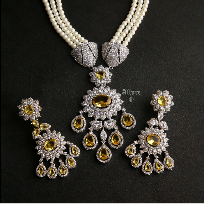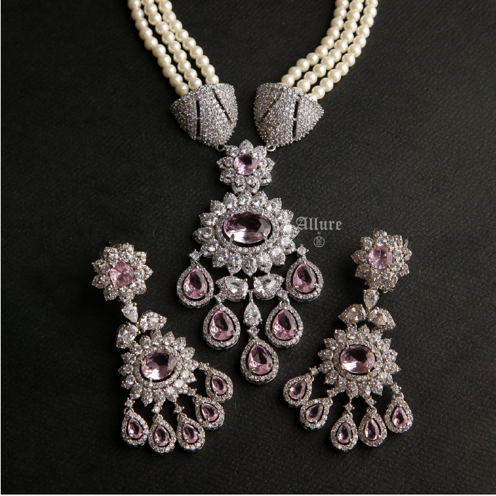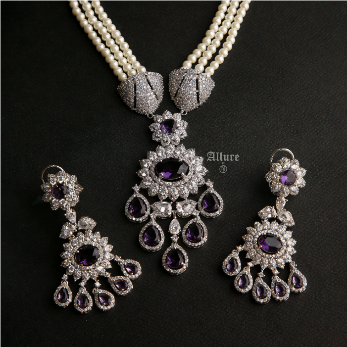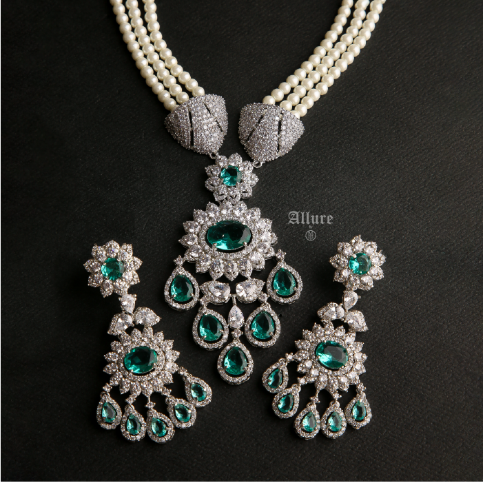 Étoile is a stunning three-layered pearl necklace set, exuding elegance and sophistication. The necklace sits gracefully close to the neck, highlighted by a triangular accent that adds a touch of allure. The set is completed with a pendant adorned with vibrant colored jades, providing a captivating pop of color. Paired with matching glamorous earrings, ?âtoile effortlessly elevates your look, making it the perfect choice for any special occasion. ¬†1. Due to the delicate nature of our jewelry, we regretfully cannot accept returns or exchanges. 2. Meticulously crafted using high-quality alloy, adorned with radiant gold/rhodium plating. 3. To maintain its allure, kindly refrain from contact with perfume or water. 4. Handle with care to keep your jewelry looking flawless over time. 5. Crafted to replicate the charm of fine jewelry without the high cost. 6. Created to be gentle on sensitive skin, offering both style and comfort. 7. Store in provided pouch or box to prevent damage and tangling. 8. Store in an airtight container to protect against tarnishing. |
