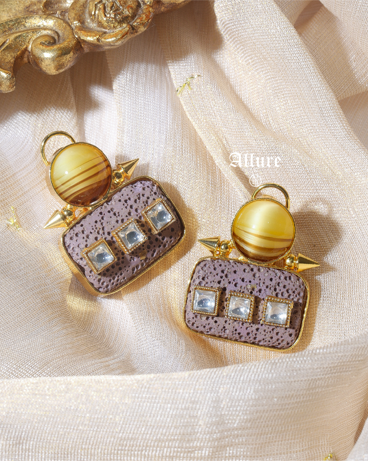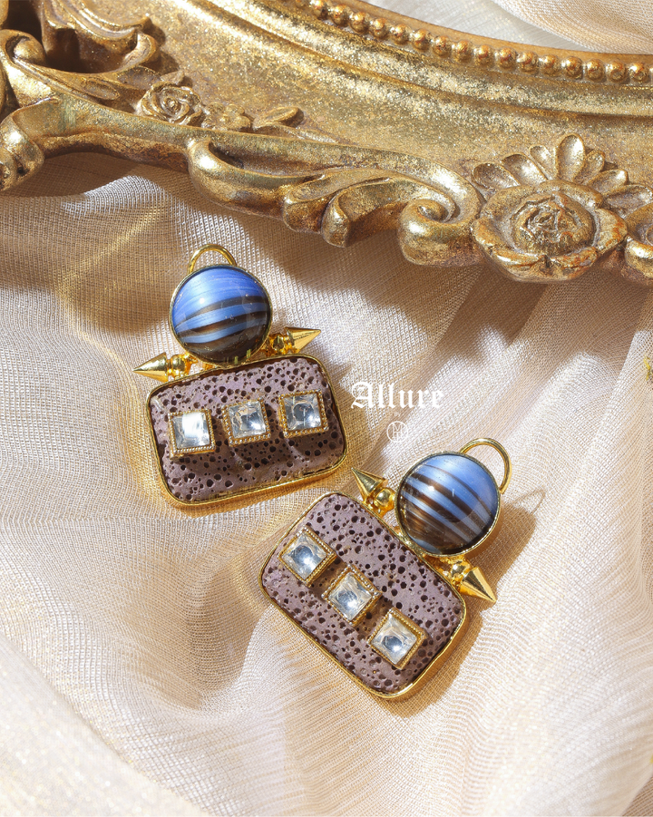 A fusion of contemporary design and timeless charm, the Fresha  earrings feature deep blue or gold striped gemstones, textured stone detailing, and gleaming gold accents. Perfect for those who love a bold yet sophisticated statement piece.
