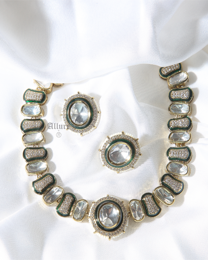 A radiant celebration of classic elegance, Gehna features a regal arrangement of reflective kundan stones bordered in delicate meenakari detailing. The ethnic set, complete with matching earrings, mirrors the craftsmanship of timeless heirlooms while adding a graceful flair to modern-day ensembles.    1. Due to the delicate nature of our jewelry, we regretfully cannot accept returns or exchanges. 2. Meticulously crafted using high-quality alloy, adorned with radiant gold/rhodium plating. 3. To maintain its allure, kindly refrain from contact with perfume or water. 4. Handle with care to keep your jewelry looking flawless over time. 5. Crafted to replicate the charm of fine jewelry without the high cost. 6. Created to be gentle on sensitive skin, offering both style and comfort. 7. Store in provided pouch or box to prevent damage and tangling. 8. Store in an airtight container to protect against tarnishing. |