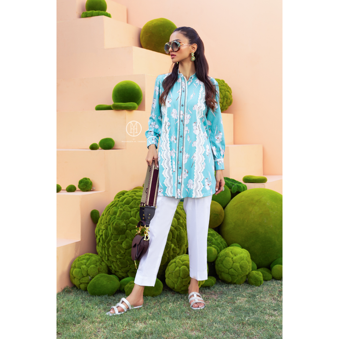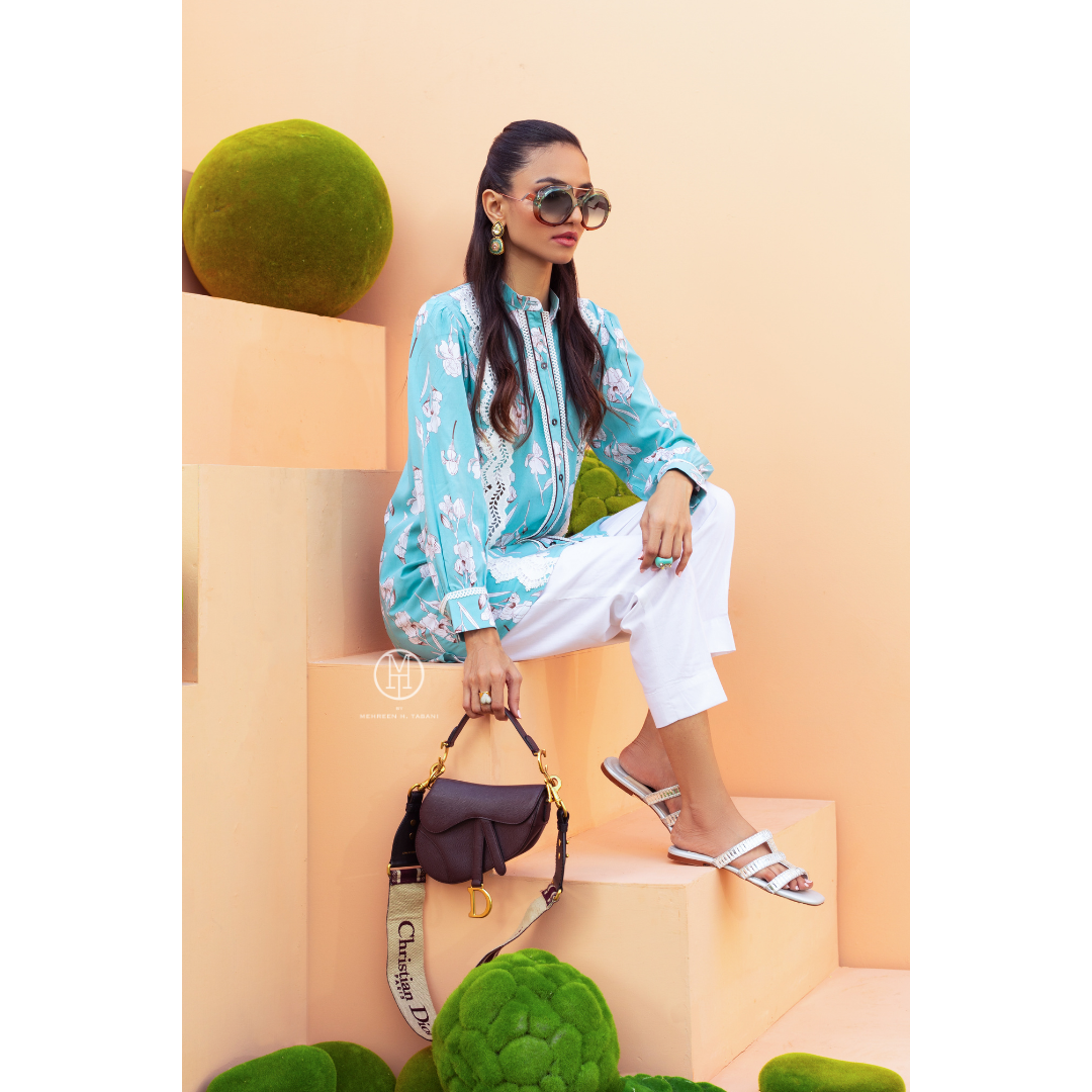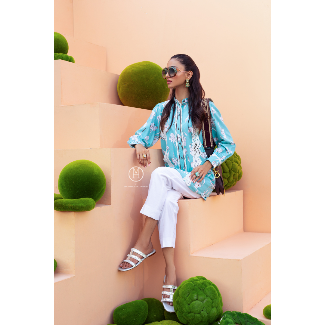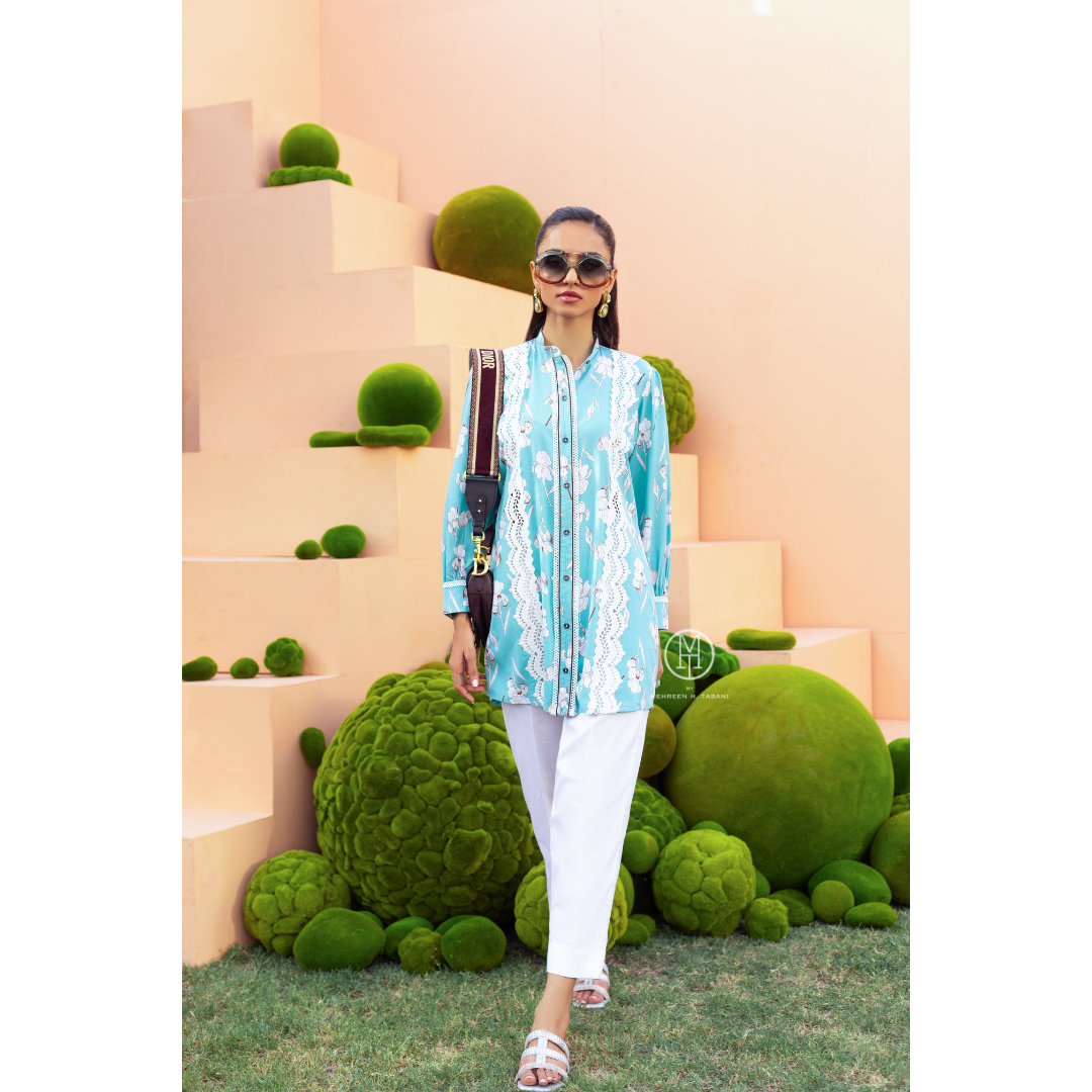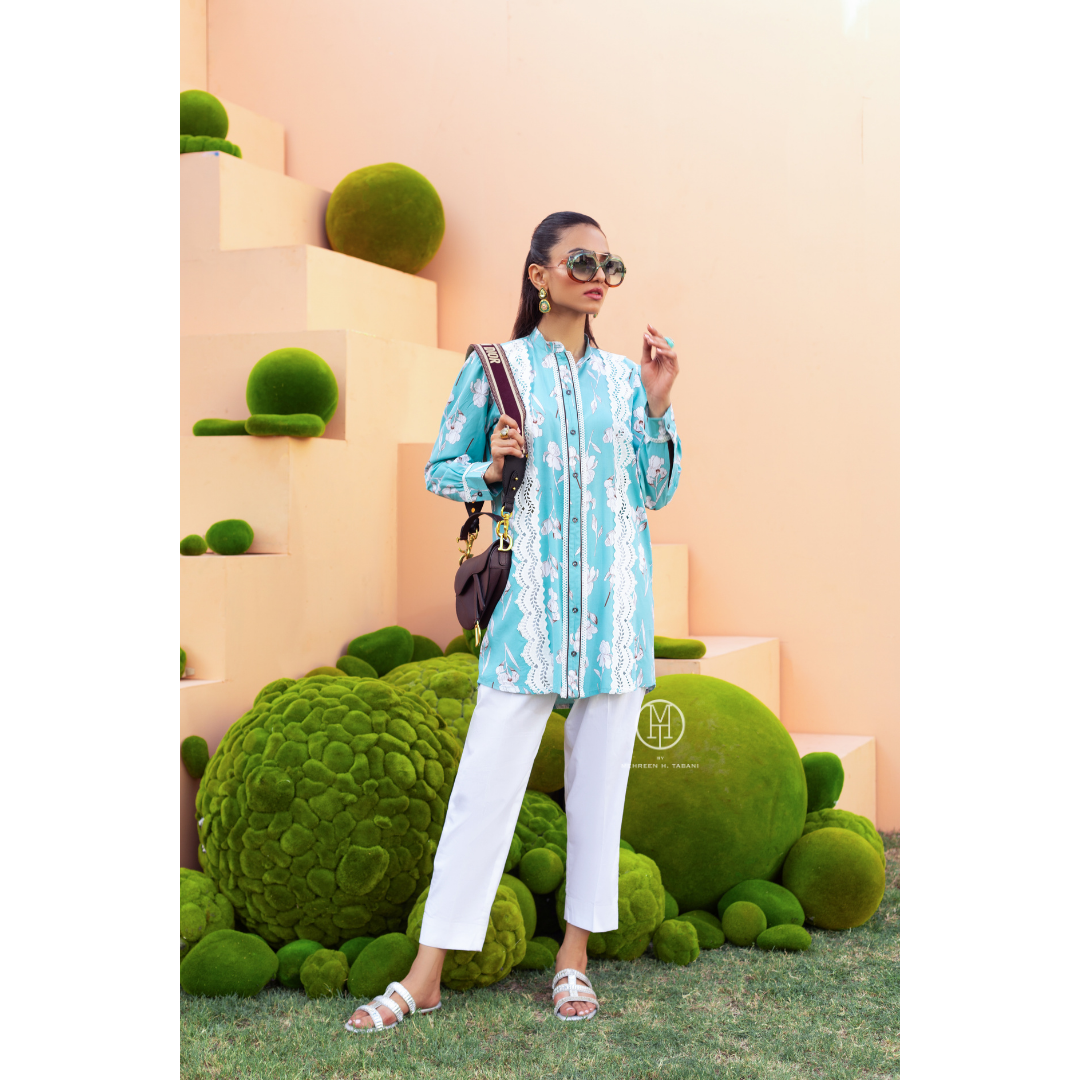 Glossip, a summery tunic hat captures the essence of sun-drenched beaches and lighthearted fun. This stylish ensemble centers around a breezy lawn shirt, ideal for the warmer days. Fashioned in a button-down style with laces, the shirt exudes an effortless elegance that makes it a versatile piece for any summer wardrobe.