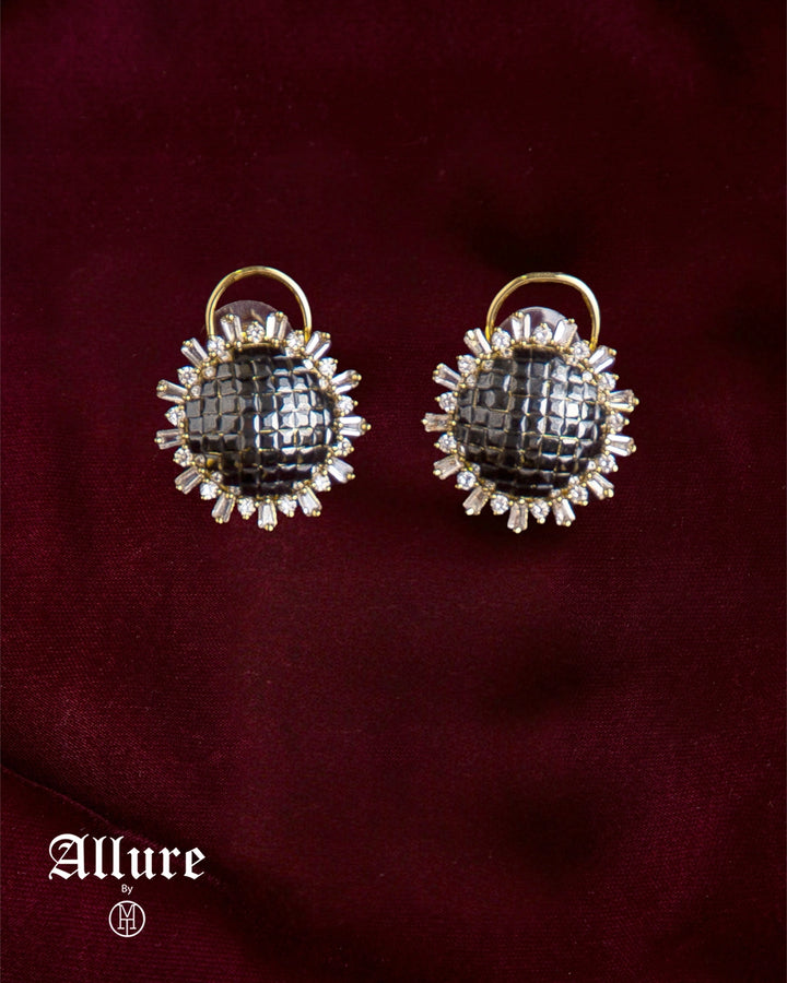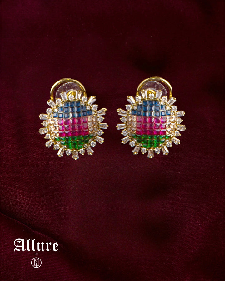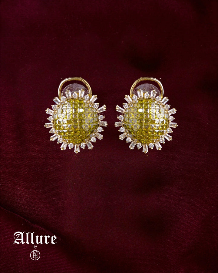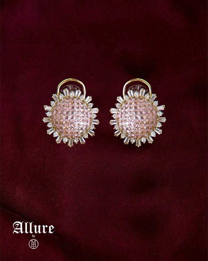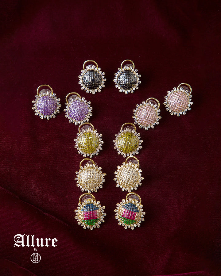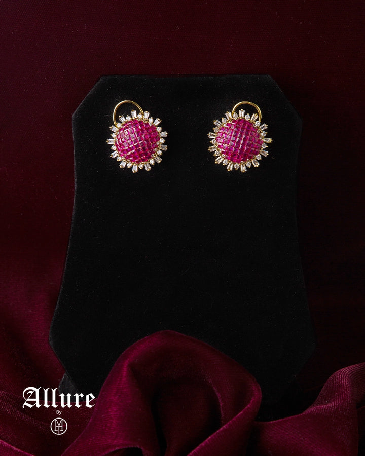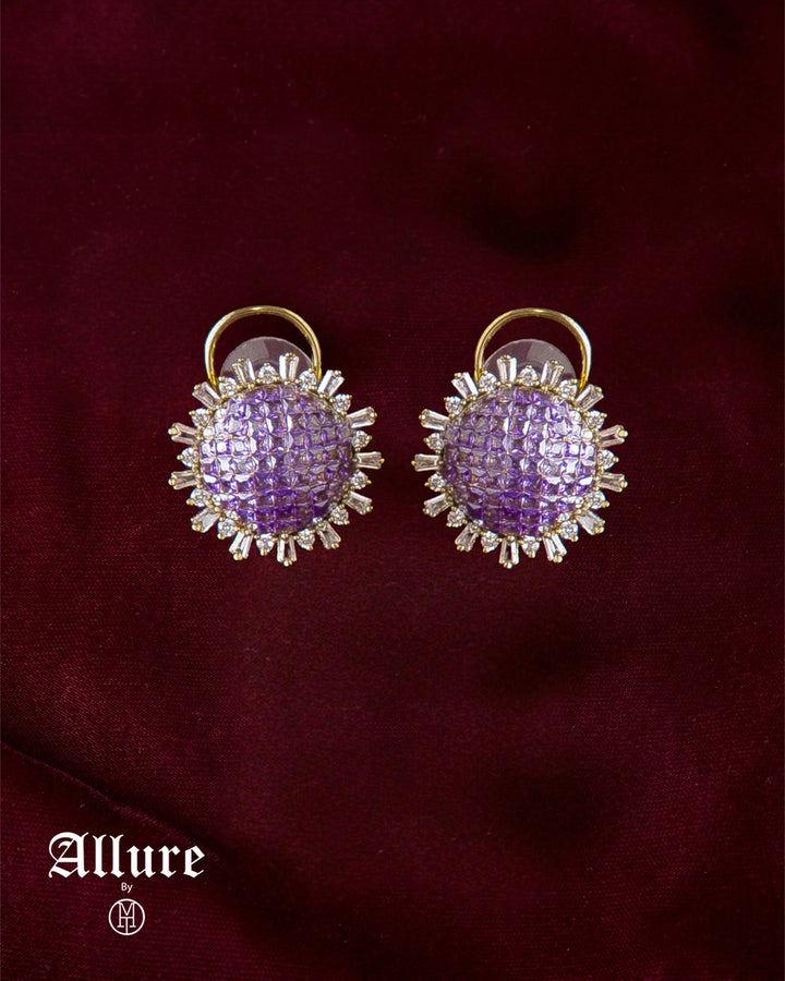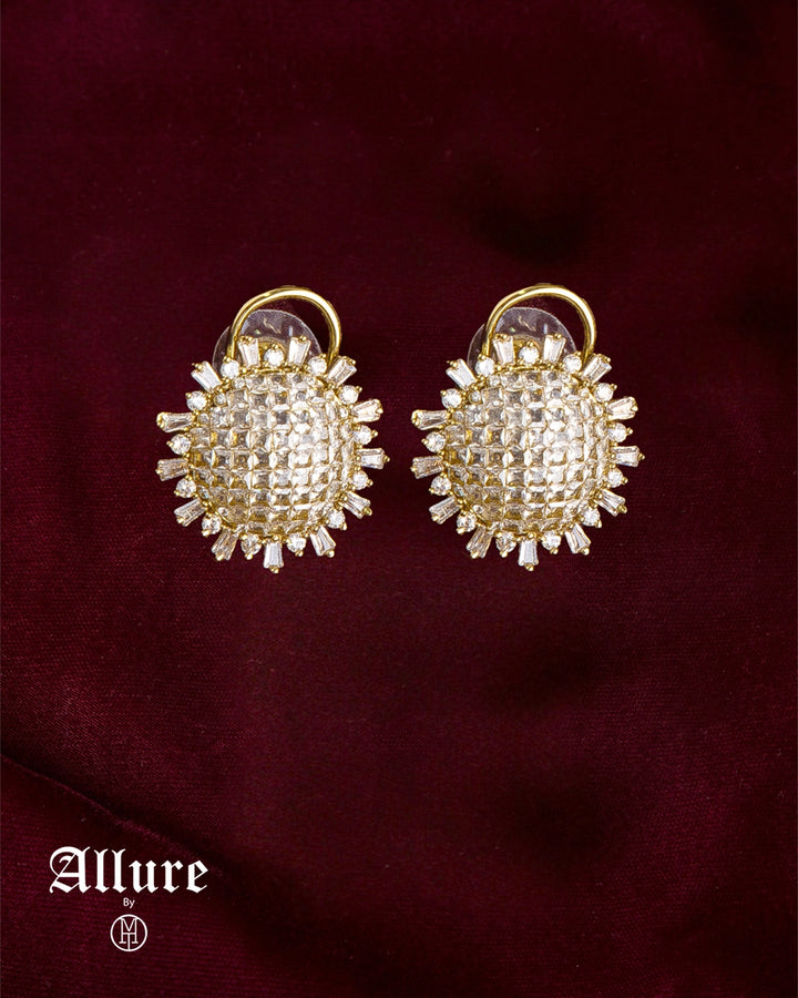 The Gulnar Studs feature delicately carved gemstones framed by a radiant sunburst halo of white stones. Set in polished gold, they blend cultural elegance with modern luxury perfect for weddings, soirées, or elevated everyday wear.