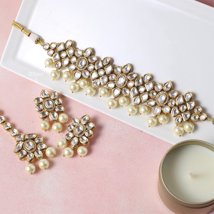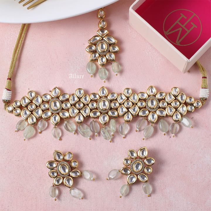 An absolutely regal kundan choker with a  floral design. Featuring matching earrings and teeka, the set is glmaorous and regal.