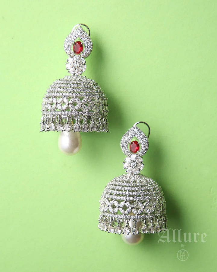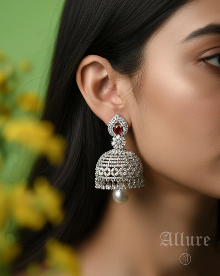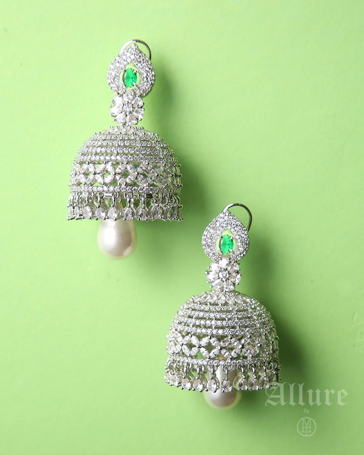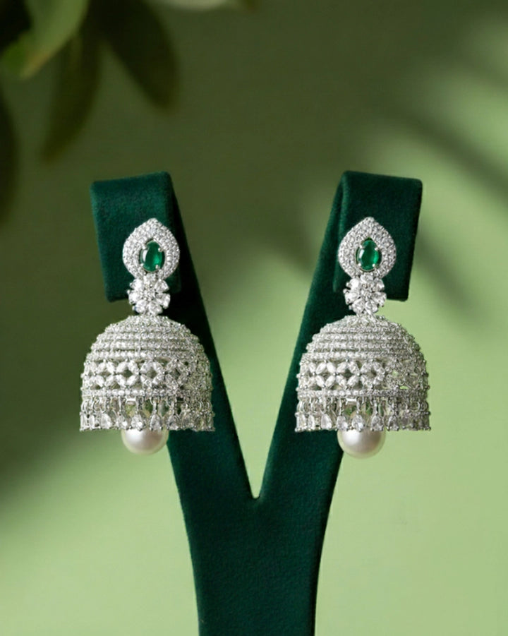 Honouring South-Asian heritage, Heirloom Noor showcases intricately filigreed jhumka-style domes fully encrusted with pav?© crystals, crowned with a petite emerald accent. A single white pearl drop hangs beneath each dome, adding a classic finish that nods to traditional heirloom earrings. The meticulous latticework and contrasting textures embody artisanal craftsmanship passed down through generations.