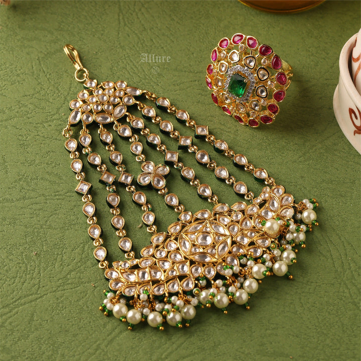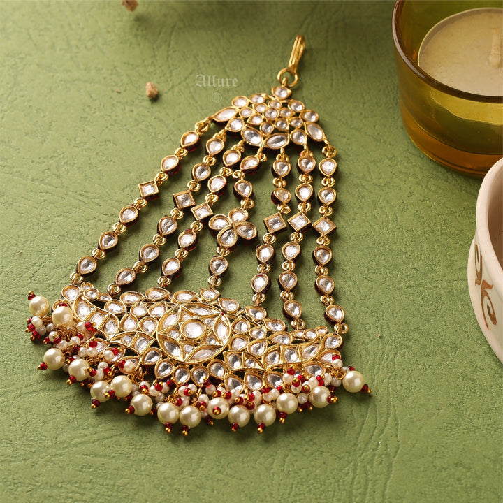 A polki jhoomar with enamel finishing completed with faux pearls for a regal look.