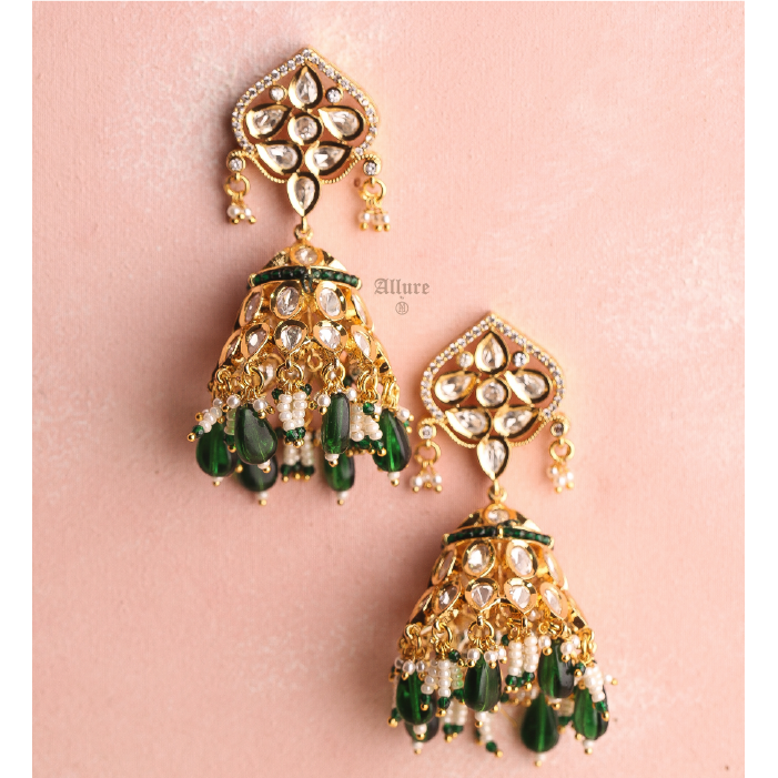 Inaaya Jhumki, a stunning blend of tradition and elegance. Featuring a paisley-inspired Polki top adorned with sparkling Zirconia, this exquisite piece is paired with a jhumki that dazzles with vibrant colored stones and delicate pearls. Perfect for adding a touch of glamour to any look!