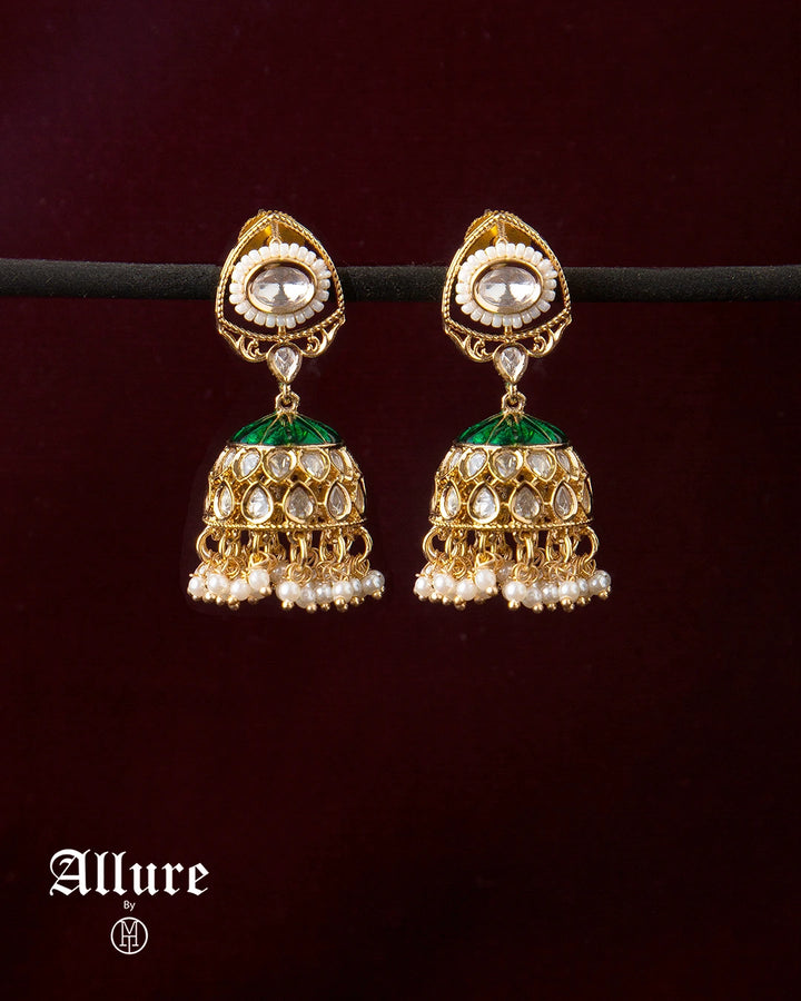 The Jharoka Jhumkis pay tribute to classic royal opulence, fusing the iconic Jhumka silhouette with dramatic Meenakari work. A delicate pearl fringe softens the design with graceful sway, while rich enamel tones and Polki brilliance lend a majestic, regal appeal.