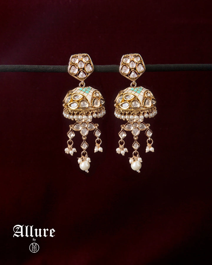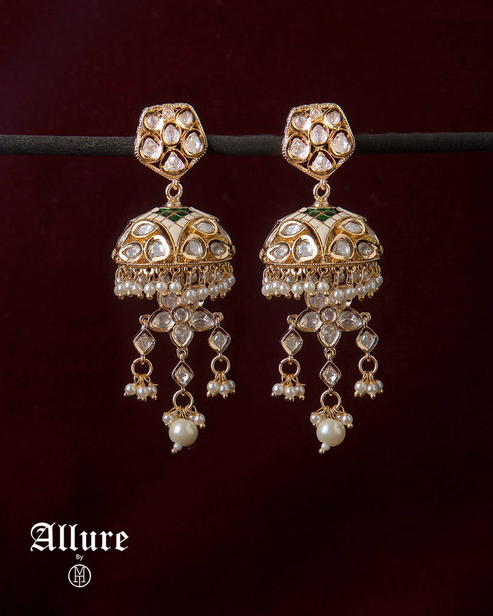 The Jhoomar Jhumkis showcase a classic bell-shaped dome adorned with white-green Meenakari and luminous Polki. Finished with cascading pearl and Polki drops, they capture the essence of traditional elegance and sparkling heritage an ideal bridal and mehndi showpiece.