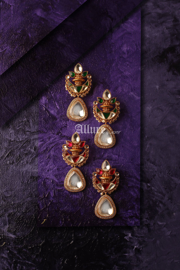 A leaf like polki top, paired with rcolored stone petal with dull gold center, completed with a hanging teardrop stone.