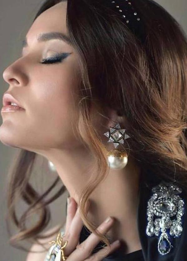 Simply breathtaking – Triangular shaped American diamonds set intricately in a diamond shaped motif with a hanging faux pearl set in a gold cup.