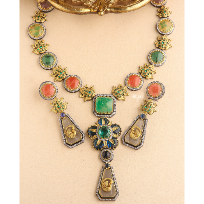 A glamorous necklace featuring pastel-colored stones set amidst Zirconia, adorned with a stunning pendant and floral motif. Paired with three-tiered earrings showcasing stones and a frog mural, this set is a true statement piece, exuding timeless elegance and artistic grandeur. 1. Due to the delicate nature of our jewelry, we regretfully cannot accept returns or exchanges. 2. Meticulously crafted using high-quality alloy, adorned with radiant gold/rhodium plating. 3. To maintain its allure, kindly refrain from contact with perfume or water. 4. Handle with care to keep your jewelry looking flawless over time. 5. Crafted to replicate the charm of fine jewelry without the high cost. 6. Created to be gentle on sensitive skin, offering both style and comfort. 7. Store in provided pouch or box to prevent damage and tangling. 8. Store in an airtight container to protect against tarnishing. |