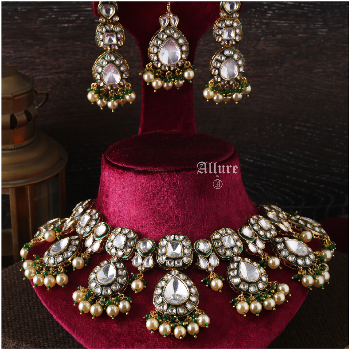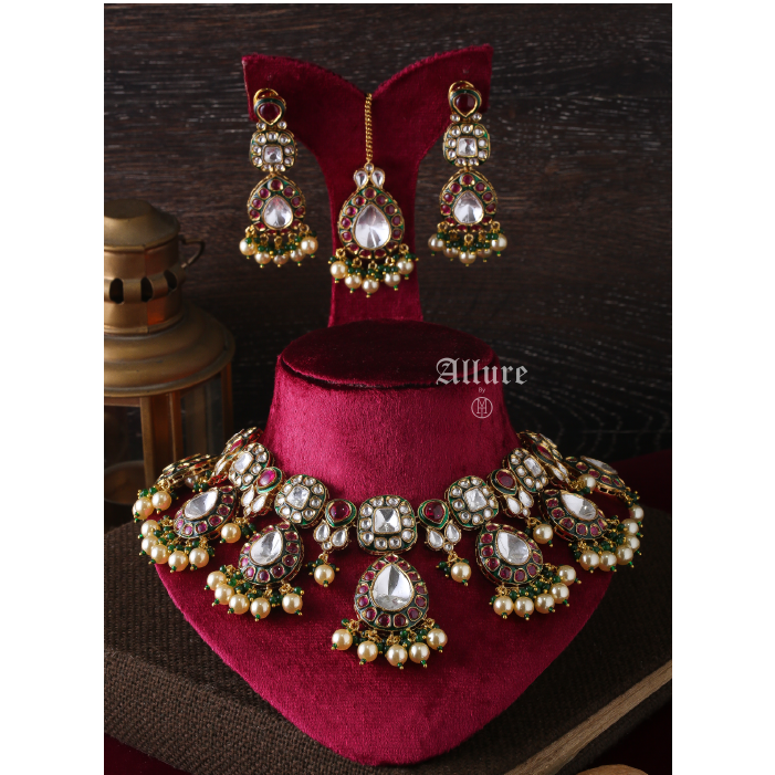 Step into a world of timeless luxury with Laaila, a mesmerizing polki set that embodies regal sophistication and artistry. This exquisite set showcases handset colored stones paired with delicate meenakari (enamel) work, a testament to superior craftsmanship.   1. Due to the delicate nature of our jewelry, we regretfully cannot accept returns or exchanges. 2. Meticulously crafted using high-quality alloy, adorned with radiant gold/rhodium plating. 3. To maintain its allure, kindly refrain from contact with perfume or water. 4. Handle with care to keep your jewelry looking flawless over time. 5. Crafted to replicate the charm of fine jewelry without the high cost. 6. Created to be gentle on sensitive skin, offering both style and comfort. 7. Store in provided pouch or box to prevent damage and tangling. 8. Store in an airtight container to protect against tarnishing.   |