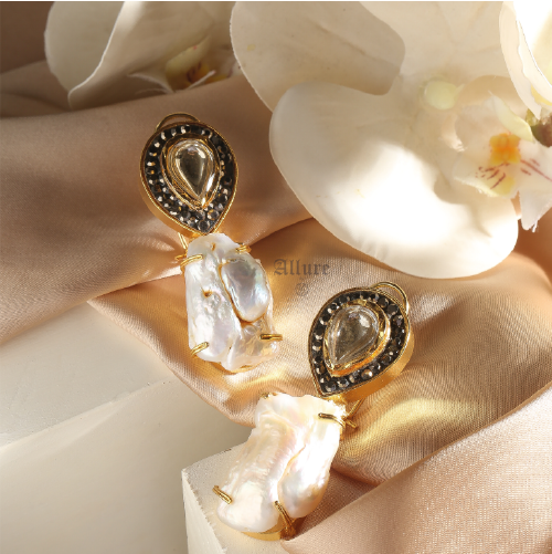 Lamore: a modern earring that exemplifies exquisite craftsmanship. The design features an inverted Polki center, elegantly framed by sparkling Zirconia with a metallic finish. Paired with a D-shaped Mother of Pearl encased in a gold rim, these earrings exude luxury and sophistication.