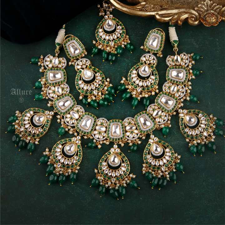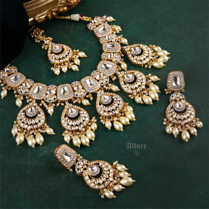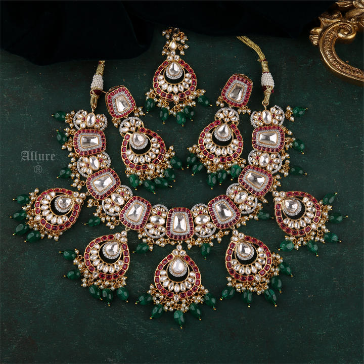 A luxe bridal set with a dull gold finish featuring intricate polki handsetting finished with faux pearls for added flair and granduer. With matching earrings and teeka, the set is timeless keepsake.
