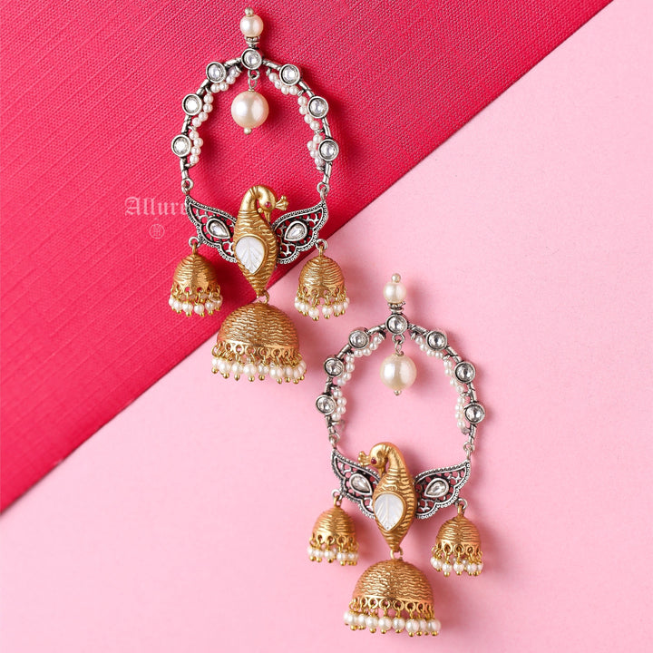 A dull gold bird paired with jhumkis paired with silver polki top.
