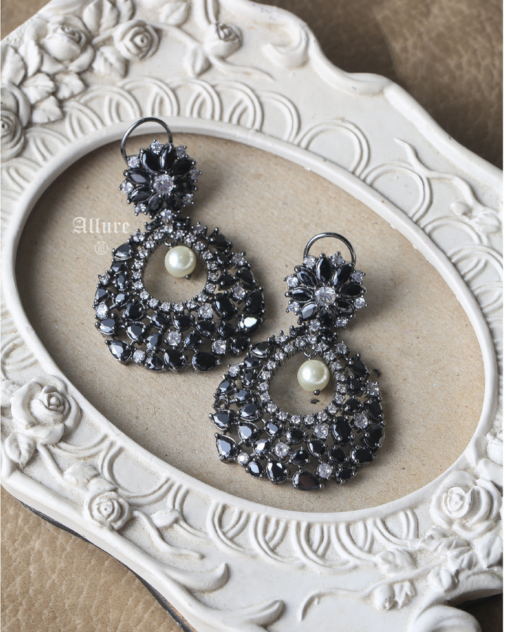 Lina features a floral-colored jade studded top, paired with a graceful dangling teardrop with a faux pearl accents adorned with vibrant colored jades. This stunning design combines nature-inspired elements with bold elegance, elevating any look.