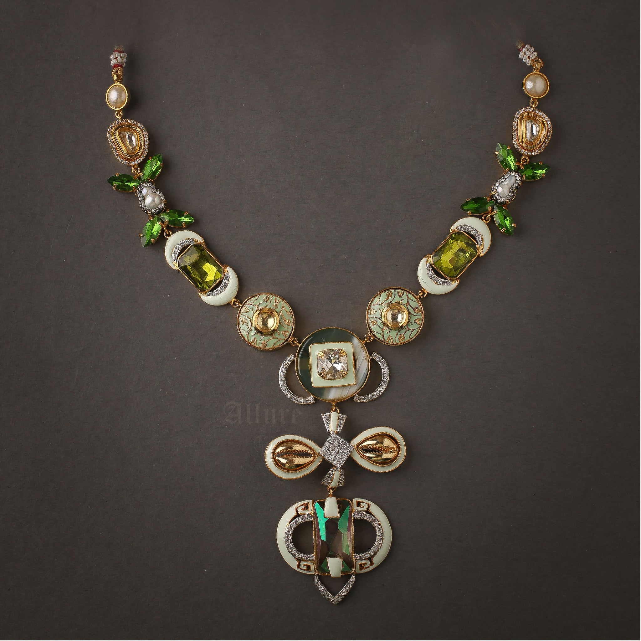Enhance your charisma with Lumia. Vibrant necklace features regal swarovskis, enamel work, polki and luxe craftmanship that makes a statement.