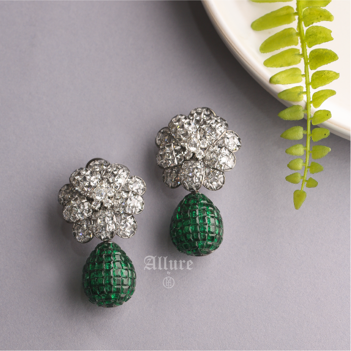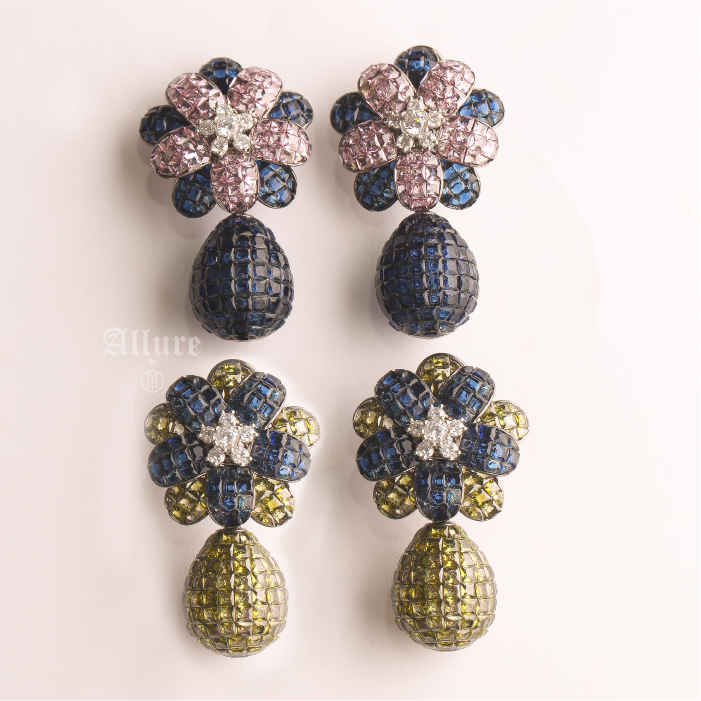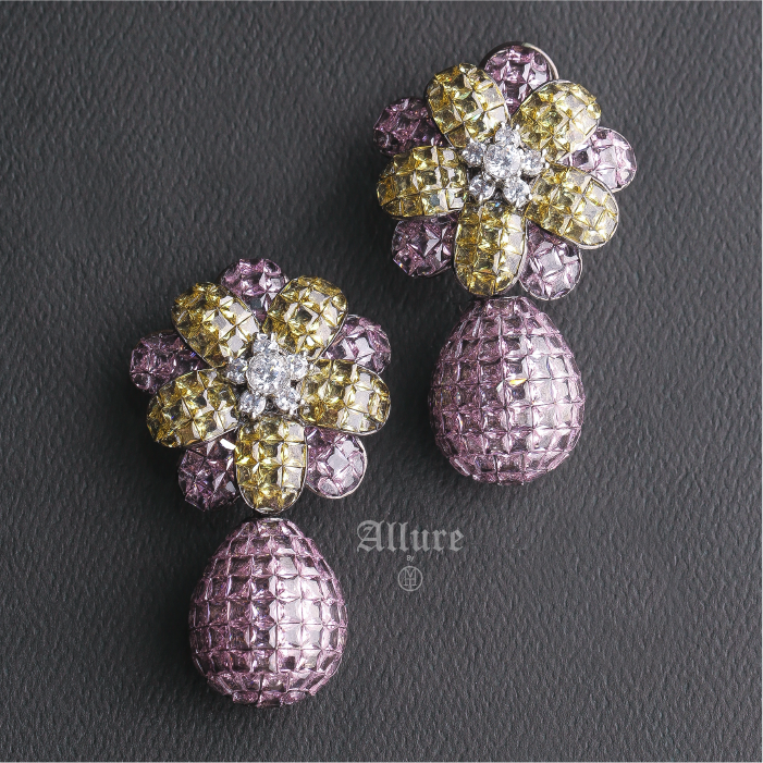 A stunning floral earring that exudes elegance. Featuring an invisible setting of stones, this piece showcases a dazzling teardrop that captures light beautifully. Hibiscus combines delicate floral design with a hint of sparkle.