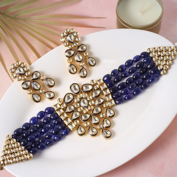 An exquisite Kundan centerpiece with luxe blue beads and matching kundan earrings that looks stunning and adds to your charm.