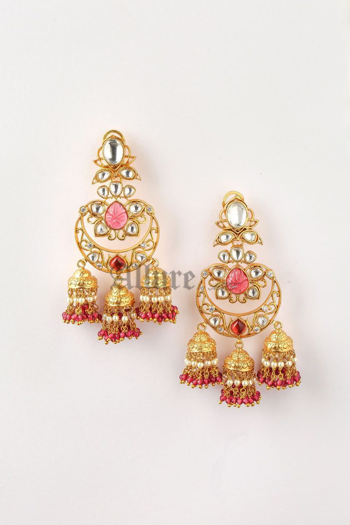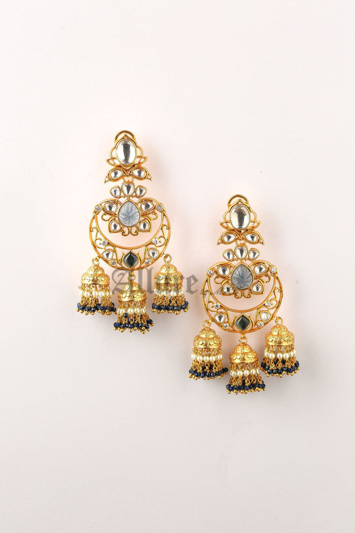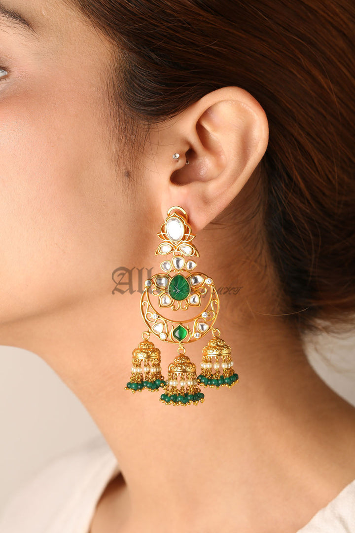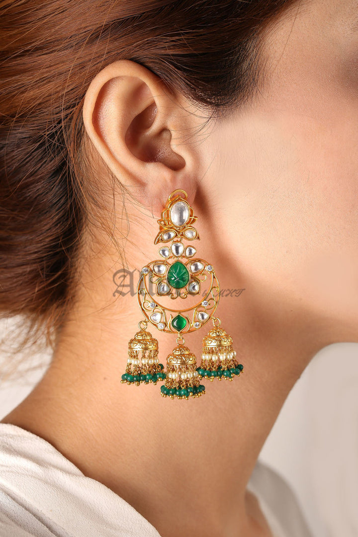 Divulge in pure elegance with Manna. Our regal earrings bring back the old world charm. Featuring intricate polki work with a chaandbaali style, finished with jhumkis, the heirlooms are a keepsake
