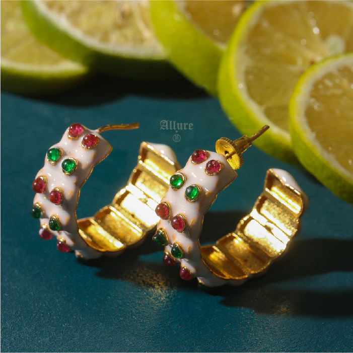 Masha, a statement piece from featuring striking hoops with a sleek enamel finish, beautifully accentuated with vibrant colored stones for a playful yet sophisticated pop of color. Perfectly blending elegance with boldness, Masha is designed for those who love to stand out.