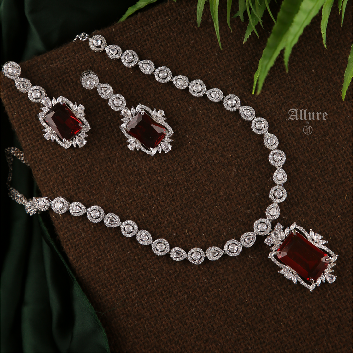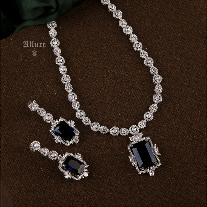 a glamorous silver set with a dainty necklace featuring a circular design encrusted with Zirconia and glamorous pendant with colored jade that elevates the look. P[aired with earrings, the set is stellar.