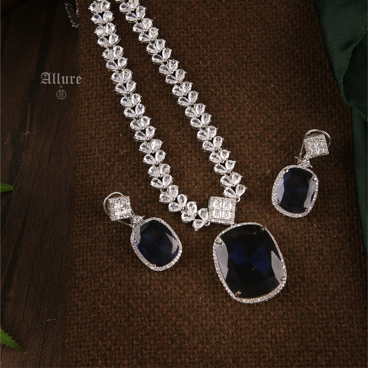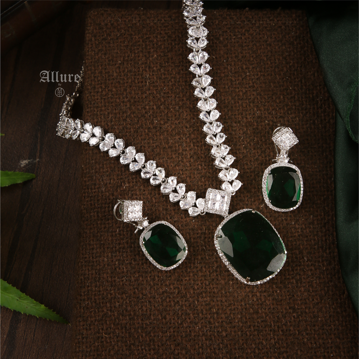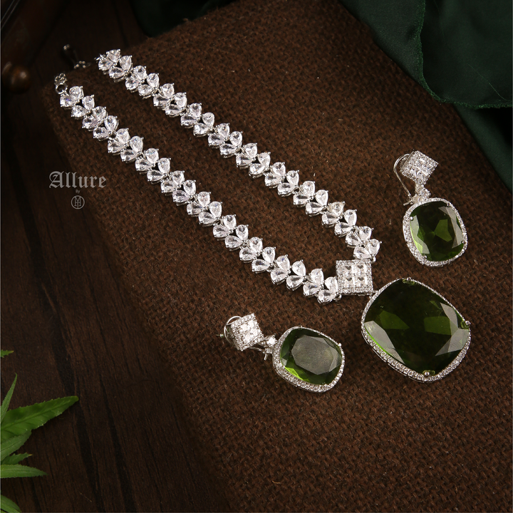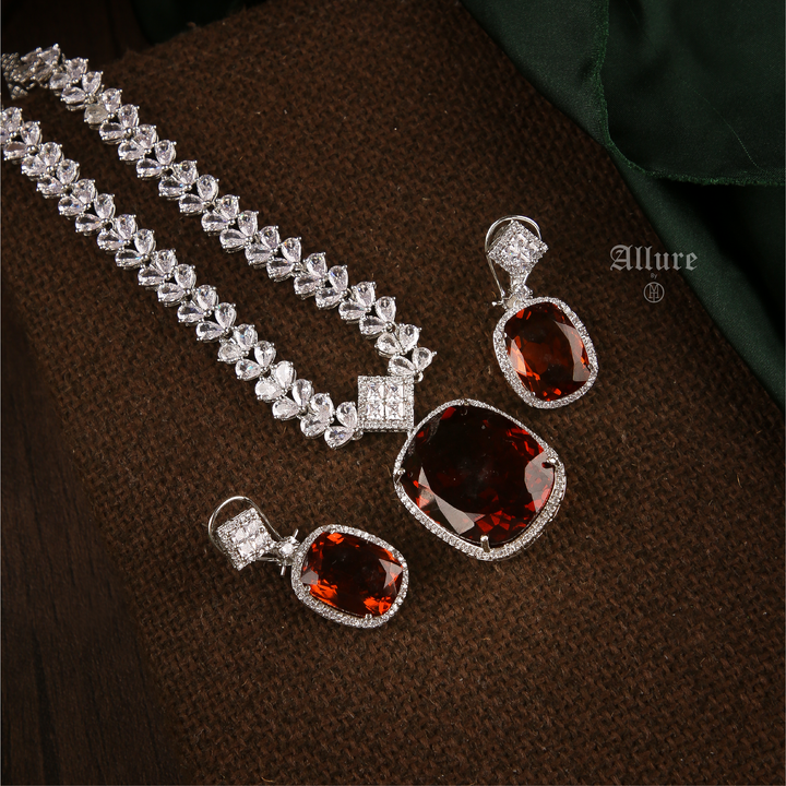 A dainty diamond inspired set with handset Zirconia and a pendant for a pop of color. Paired with matching earrings, the set is a keepsake.