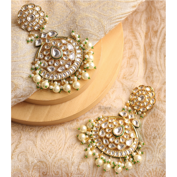 Nargis Chaandbaali, a stunning floral Polki piece adorned with hanging Angoori pearls. Paired with glamorous chaandbaali and intricate Meenakari work at the back, these earrings radiate elegance. Accented with delicate pearls and hints of green, they offer a captivating blend of traditional charm and modern allure.