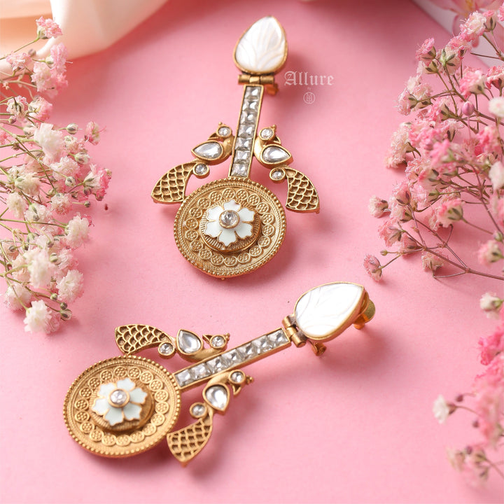 A dull gold earring with a carved teardrop stone at the top paired it a circular base with a floral pattern accentuated with intricate meenakari.