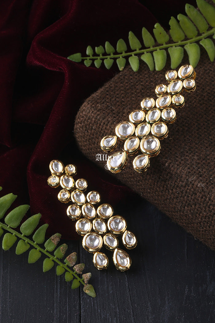 Nazra, a pair of regal kundan linear earrings exuding timeless elegance. Crafted to captivate, their radiant design embodies sophistication, making them the perfect statement for any occasion   1. Due to the delicate nature of our jewelry, we regretfully cannot accept returns or exchanges. 2. Meticulously crafted using high-quality alloy, adorned with radiant gold/rhodium plating. 3. To maintain its allure, kindly refrain from contact with perfume or water. 4. Handle with care to keep your jewelry looking flawless over time. 5. Crafted to replicate the charm of fine jewelry without the high cost. 6. Created to be gentle on sensitive skin, offering both style and comfort. 7. Store in provided pouch or box to prevent damage and tangling. 8. Store in an airtight container to protect against tarnishing. |