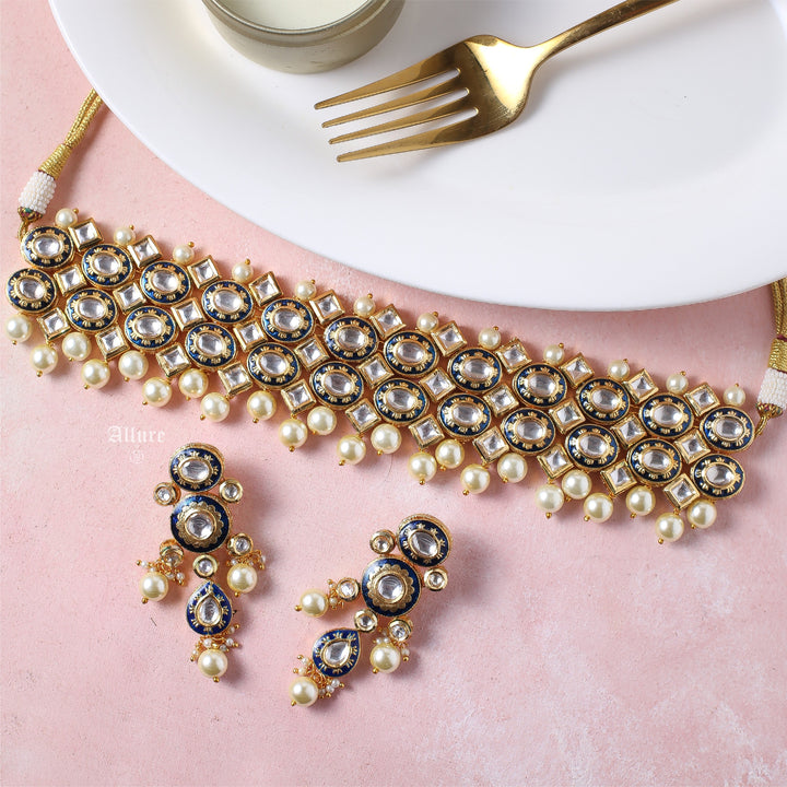 A kundan choker with blue enamel, faux pearls and matching earrings that looks regal and exquisite.