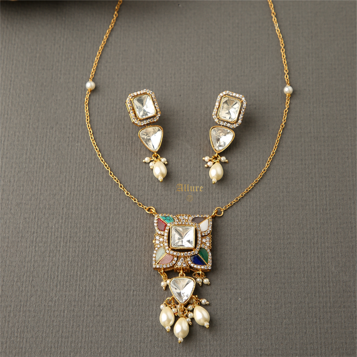 A glamorous polki pendant with chain paired with dainty polki earrings.