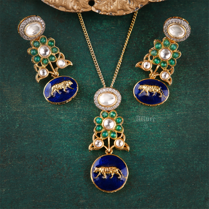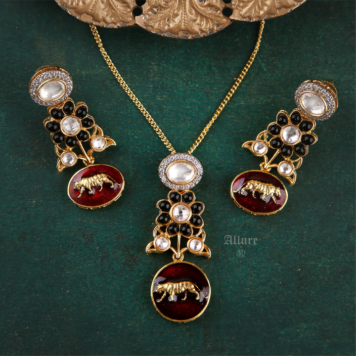 Impressive and alluring, the Nirmal pendant set features colored jades set intricately, a floral motif and a bold lion mural.  the pendant set is a statement.
