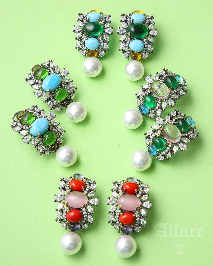Graceful and lyrical, Pearl Sonata combines multi-hued cabochon studs with lustrous teardrop pearls that sway gently below. The contrast of smooth opaque cabochons with the pearlescent sheen creates a soft rhythm of colour and light, reminiscent of musical notes on a score. Meticulous claw settings and a polished antique silver frame complete this poised, feminine design.