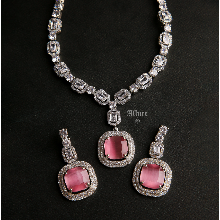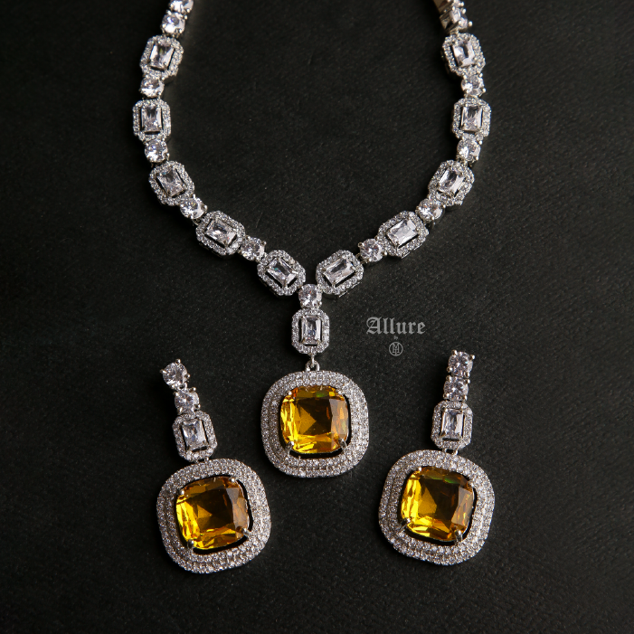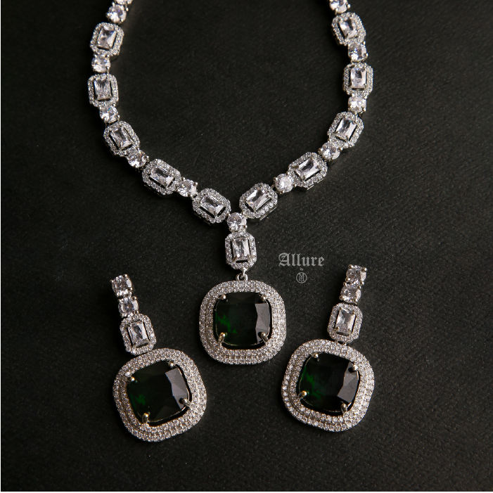 Perle, a stunning diamond-inspired jewelry set that exudes elegance and sophistication. This dainty necklace features intricate baguettes and shimmering Zirconia, beautifully complemented by a pendant adorned with colored jades and sparkling Zirconia for that extra touch of glamour. Perfect for adding a luxurious accent to any outfit, Perle is designed to dazzle and captivate.   1. Due to the delicate nature of our jewelry, we regretfully cannot accept returns or exchanges. 2. Meticulously crafted using high-quality alloy, adorned with radiant gold/rhodium plating. 3. To maintain its allure, kindly refrain from contact with perfume or water. 4. Handle with care to keep your jewelry looking flawless over time. 5. Crafted to replicate the charm of fine jewelry without the high cost. 6. Created to be gentle on sensitive skin, offering both style and comfort. 7. Store in provided pouch or box to prevent damage and tangling. 8. Store in an airtight container to protect against tarnishing.  |