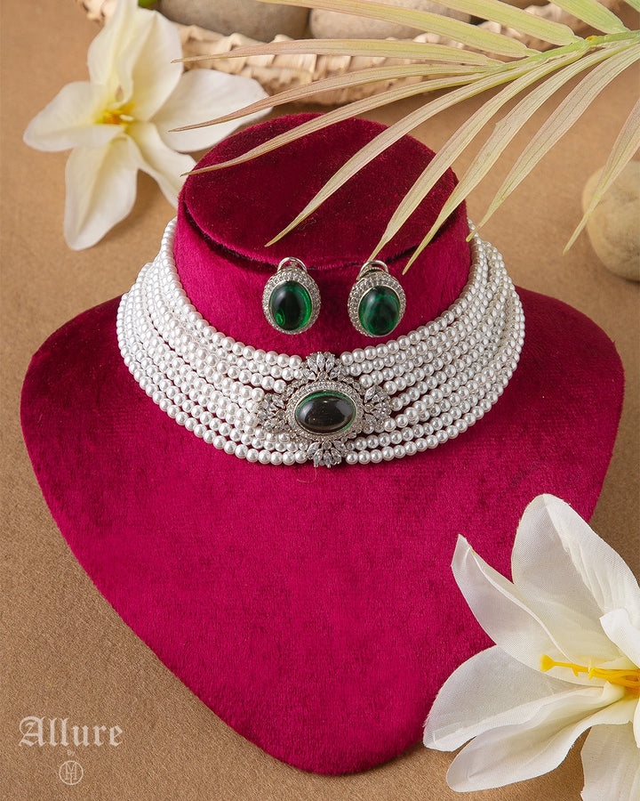 A study in contrast, craft, and polish, Pearl Mirage brings a sculpted, high-impact look through layered pearls and a bold rounded centre stone. The multi-row choker sits cleanly along the collarbone, creating a full, structured neckline with its smooth, uninterrupted pearl curve. At its centre lies the luminous motif – a coloured stone framed with handset crystals that lend a polished radiance. The matching earrings echo the same colour and cut, completing the set with balance.