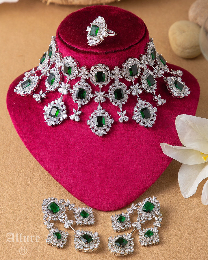 Empressa carries the unmistakable character of regal craftsmanship: bold, structured, and richly detailed. Each emerald-cut stone is framed by intricate clusters, creating a rhythm of shape and brilliance that feels opulent without ever losing refinement. The cascading design gives the choker a stately presence, echoed gracefully in the earrings and ring for a complete, commanding set. Empressa stands as a tribute to grandeur done with precision and poise.