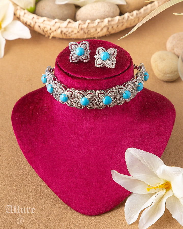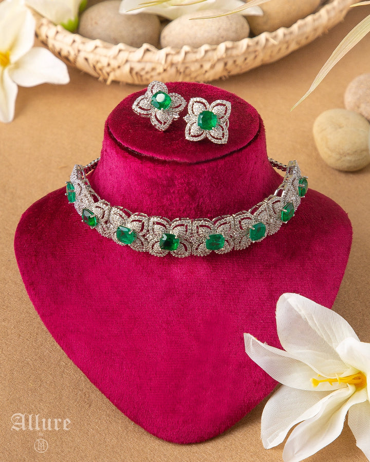 Inspired by petal forms and couture detailing, Florenza brings a soft, sculpted charm to the neckline. The choker’s floral-carved motifs are set with rounded stones that add a fresh, luminous pop against the intricate crystal work. Paired with matching earrings that echo the same refined silhouette, the set feels feminine without being delicate. A beautiful choice for those who appreciate jewellery that blooms with confidence.