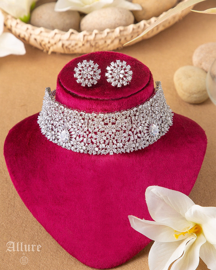 An interplay of light and fine craftsmanship, Celestique forms a gentle constellation across the neckline. The floral lattice is arranged with airy precision, each cluster placed to create a smooth, uninterrupted field of radiance that sits beautifully as a structured choker. Pear-cut centres anchor the design, adding a refined lift without overwhelming its delicate rhythm. The matching studs mirror the same starburst design, offering a coordinated finish that feels composed and modern. Crafted for celebrations where grace relies on detail, Celestique to bring a soft, celestial glow to elevate any outfit.